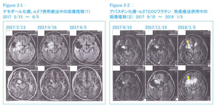 34歲女性患者,3個孩子的母親。2016年6月確診后手術(無法完全切除)、放療,2017年1月開始口服化療時同時開始αβT細胞治療。至2017年8月腫瘤持續縮小,且恢復了正常生活。但8月中旬開始殘留腫瘤開始增大,改變化療并追加DC疫苗,生活質量無下降。至11月影像檢查腫瘤縮小,后2018年1月開始腫瘤又開始增大,3月29日長眠。多學科治療,從發病至死亡21個月。期間CD4/CD8比值在維持了1年左右的穩定、低水平,免疫抗腫瘤功能比較好,且這個期間體重增加了4kg。另有DC疫苗的臨床研究表明,該方法作為腦膠質瘤術后的治療方法,顯示出了延長生存期的傾向。