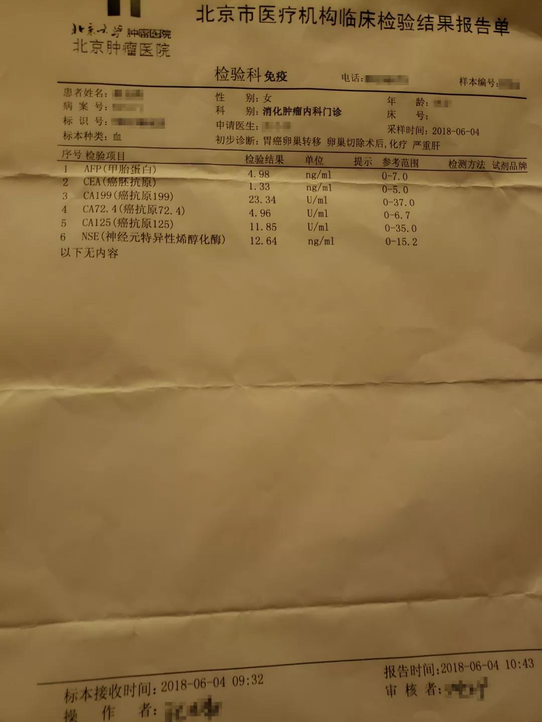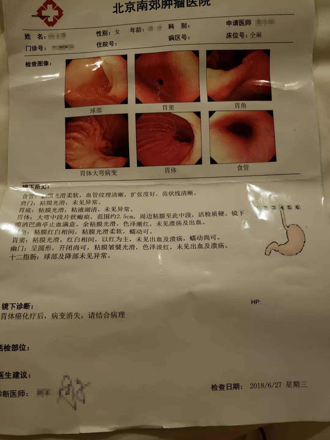 3個(gè)月前還維持不變呢,接著阿姐就用微信給我發(fā)來了最近的檢查報(bào)告,6月4日的腫瘤標(biāo)志物指標(biāo)已經(jīng)在正常,6月28日胃鏡報(bào)告則顯示“胃體癌化療后,病變消失,請結(jié)合病理!”。