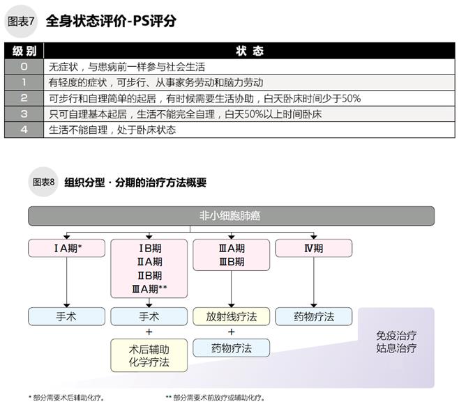 使用哪種方法治療肺癌,必須綜合考慮腫瘤的組織類型、病理分期、患者年齡、整體生理狀態(PS評分 圖7)、心?肝?肺?腎的臟器功能狀況以及是否有其他疾病的既往史。一般情況下PS評分在0~2之間的可以考慮采用手術、放療和化療,身體狀態不佳的只能采取副作用小的治療,如免疫細胞治療。