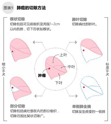 肺癌手術是在全身麻醉的情況下進行的。早期肺癌多用胸腔鏡進行切除手術,而普通的開胸手術需要從后背切開7~15cm的皮膚,然后切開肋間肌,開胸切除病灶、肺葉和周圍淋巴結(淋巴廓清術)等。人類有雙肺,左肺2個肺葉,右肺3個肺葉,開胸手術時視病狀切除1個肺葉或者整側肺(標準手術 圖9)。 但是根據患者的身體狀態和術后影響呼吸的評估,可行縮小手術。