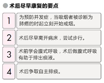 肺癌術后,為了排出肺內滯留的血液、體液和空氣,需要在胸腔內插入引流管2~4日。如果術后無特別異常,第二天患者就不用專門吸氧了,可以開始嘗試進食和步行,2周后出院。有些術后行輔助化療,可以提高治愈率。術后盡早嘗試活動身體、下床、步行、腹式呼吸,有助于減少術后并發癥,康復速度更快。