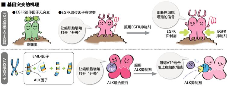 EGRF是一種表皮生長因子受體的蛋白質,大量存在于癌細胞表面,是一種促使癌細胞增殖的開關。構成EGFR遺傳基因的酪氨酸激酶發生突變,使癌細胞增殖開關處于“開”的狀態,導致癌細胞無限增殖。