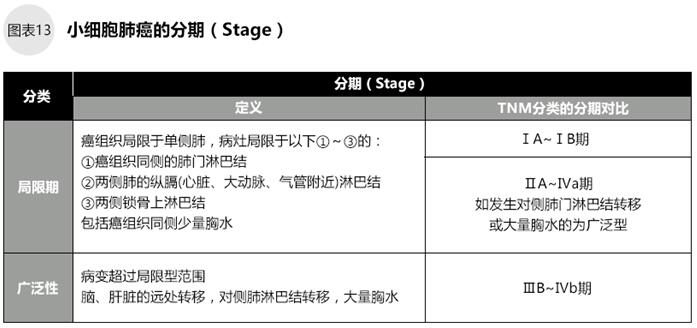 Ⅱ期以后的小細胞肺癌治療以化學療法為主,ⅡA-ⅢB期(未發生對側肺門淋巴結轉移、無大量胸水)只有局部病灶的行抗癌劑+放射線聯合治療;ⅢB~Ⅳ期的行抗癌劑化療。抗癌劑的組合可以用“PE療法=順鉑+依托泊苷”與“CAV療法=環磷酰胺+多柔比星+長春新堿”交替;在日本,標準治療首選“PI療法=順鉑+伊立替康“。如遇高齡患者,PS2(狀態評價)以上的首選”卡鉑+依托泊苷“療法。這些化療都以3~4周為一個療程,連續進行4~6個療程的治療。