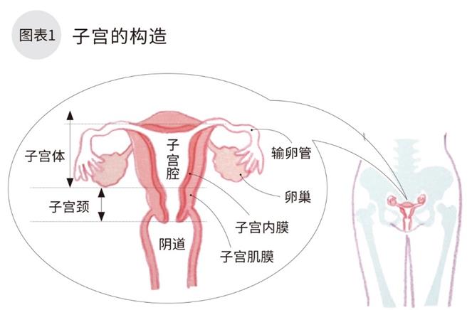 子宮主要由肌肉組成,分兩個部分,靠近子宮入口的宮頸部和深處的子宮體。非妊娠期的子宮大小約比雞蛋稍大一點。