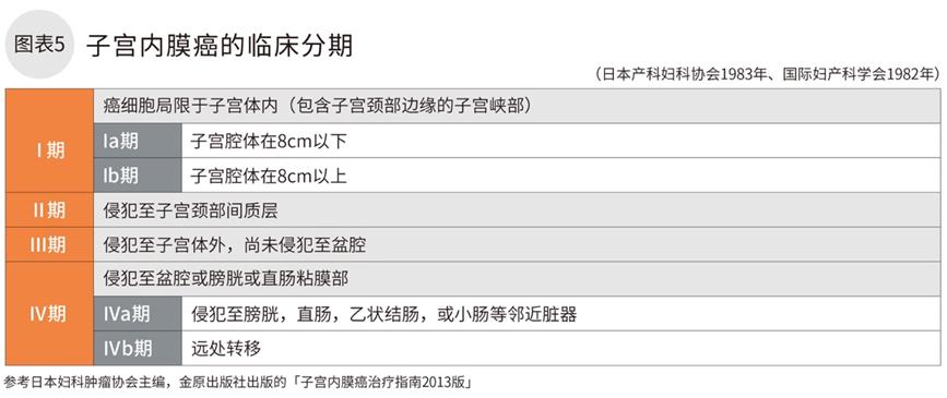 為了制定治療方針,評估癌細胞的浸潤范圍的判斷標準即為分期。日本婦產科學會制定了《臨床分期》(圖5)和《術后病理分期》(圖6)2種分類的標準。該標準基于2008年改版的國際婦產科聯合會(FIGO)的分類標準,并于2011年再次改版而成。