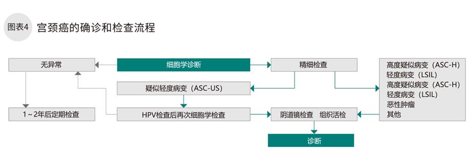 宮頸癌的發病過程(圖表3)很清晰,宮頸癌篩查可發現癌前病變。根據歷時10年的跟蹤調查,從細胞異形到發展為惡性腫瘤的過程,約3%為輕度改變,約10%為中度改變,約21%會進展為重度改變。通常,輕度和中度改變無需治療,定期隨訪即可。重度改變的需要開始治療。