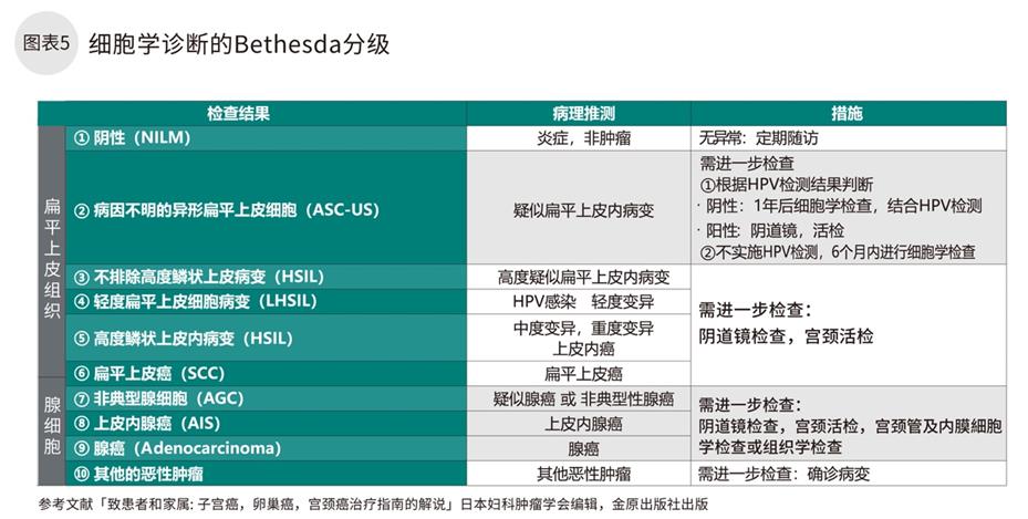 宮頸癌篩查中,用棉簽或小刷子刮取宮頸部細胞進行細胞學診斷。如果疑似宮頸癌,將繼續進行精密檢查(圖表4)。細胞學診斷依據Bethesda分級系統(圖表5)。30歲以上需要細胞學診斷與HPV檢測結合。30歲以下的,雖然HPV陽性幾率較大,但一般可自行恢復,細胞學診斷有異常時再實施HPV檢測即可。