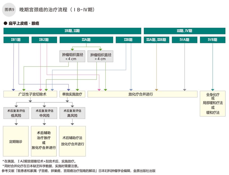 癌細胞浸潤至宮頸部基質的ⅠB期,擴散超過宮頸部但尚未到達陰道下1/3,或尚未到達盆腔壁的Ⅱ期,實施廣泛性子宮全切術,將子宮及周邊的組織,卵巢,陰道的一部分,以及淋巴結等一并摘除。術后復發風險較大或無法手術的,可實施放療,或放化療聯合。Ⅲ期(癌細胞浸潤至陰道下1/3和盆腔)一般不予以手術,實施放化療聯合或單獨放療。發生遠處轉移的Ⅳ期,原則上實施藥物療法(圖表9)。
