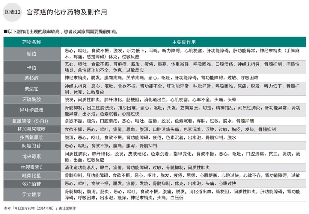 宮頸癌的化療藥物中,鉑類的治療效果最好,通常聯用其他不同機理的化療藥物。現階段,順鉑+紫杉醇的聯用為標準治療藥物,卡鉑+紫杉醇的聯用也開始用于治療。但是由于化療藥物對正常細胞也有影響,會出現各種副作用。尤其是對新陳代謝旺盛的細胞,如頭發,口腔和消化器官的粘膜,骨髓等影響較大,容易引起脫發,口腔潰瘍,腹瀉,骨髓抑制等。適用于肝臟,腎臟,骨髓功能等沒有大問題的患者。但如果副作用反應較大,可以考慮調整甚至停用藥物。對于治療產生的副作用和應對方法需要提前知曉并重視。