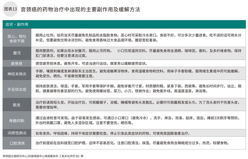 自覺癥狀中最有代表性的就是惡心和嘔吐。通常提前服用止吐劑來控制。如果有手腳麻木,疼痛,浮腫等神經末梢炎癥狀以及手足綜合癥,則需要盡早治療。圖表13中將各種癥狀的緩解方法羅列出來了。不管發生什么副作用,提前知曉一般都可以緩解。盡可能避免中斷或終止治療。