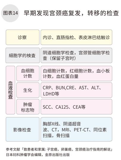 宮頸癌的復發約80%~90%發生在治療后的5年內,5年后也有可能復發。大多數為盆腔內復發,而淋巴結,肺,肝臟,骨等遠處轉移也容易發生。因此治療后前3年內每1~3個月,第4~5年每6個月,第6年開始每年1次需要進行定期隨訪檢查(圖表14)。