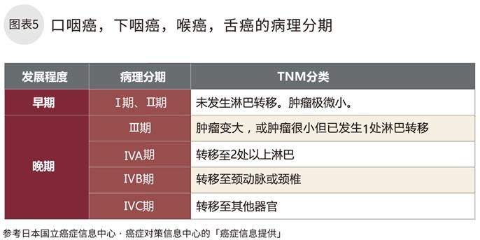 病理分期用來表示腫瘤的擴散范圍。頭頸癌一般分0期、Ⅰ期、Ⅱ期、Ⅲ期、Ⅳ期(ⅣA、ⅣB、 ⅣC)。由以下3個指標決定。①腫瘤原發灶擴散到哪里(T);②是否發生頸部淋巴轉移以及轉移的范圍,單側還是雙側(N);③是否發生其他器官的轉移(M)。例如:咽癌或者喉癌中,腫瘤的發生部位不同,T分類不同;根據腫瘤的類別具體劃分T,N,M分類。在口咽癌,下咽癌,喉癌,舌癌中,Ⅰ期和Ⅱ期時無淋巴轉移。