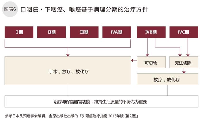 頭頸癌的主要治療方法:手術,放療,藥物療法。具體用哪種治療方法,單獨用,還是聯合用,要結合腫瘤的類別和病理分期,遵循治療指南實施治療。口咽癌,下咽癌,喉癌等在Ⅰ~ⅣA期時,手術+放療,或者放療+藥物治療;ⅣB期時已經不再適用手術,除了特殊情況外,原則上同ⅣC期,實施以放療,放化療為中心的組合治療方案(圖表6)。舌癌主要靠手術治療。