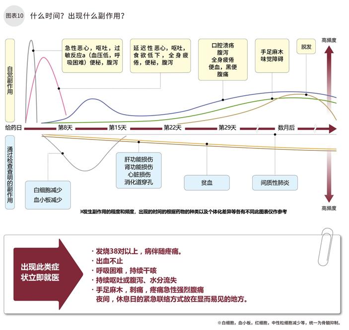 最近,減輕化療副作用的方法已經得到了改進。但如果副作用很強烈,有必要考慮換藥或者停藥。有關藥物療法容易出現的副作用,癥狀和緩解方式(圖表11),請患者一定要提前和主治醫生,護士,藥劑師詳細溝通。