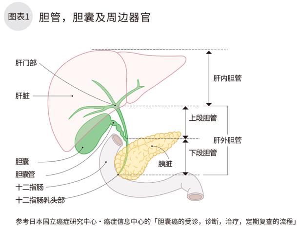 膽道是運送膽汁的管道,是膽囊,膽管,十二指腸乳頭部的總稱。發生在這些部位上的惡性腫瘤被稱為膽道癌(圖表1)。