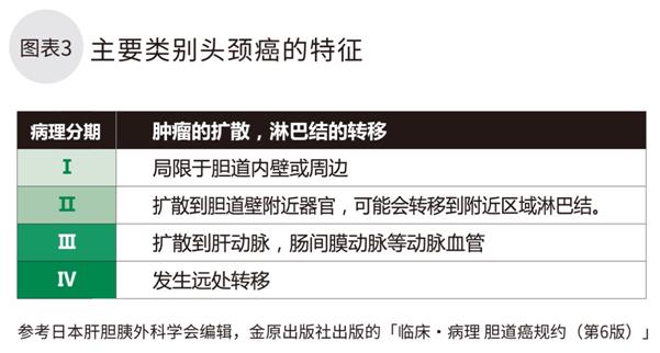 病理分期用來描述惡性腫瘤的嚴重程度,用來判斷是否可以手術,手術可切除多大范圍等,非常重要。膽道癌的病理分期,根據腫瘤的擴散程度(范圍和深度),以及是否有淋巴,血管,周邊器官的轉移等大致分為Ⅰ~Ⅳ期的四個階段(圖表3)。