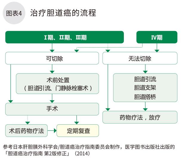 膽道癌Ⅳ期時由于發生轉移,手術可能無法從轉移的淋巴或器官中剝離腫瘤,此時的標準治療為藥物療法。出現黃疸的,必須實施膽道引流(圖表4)。