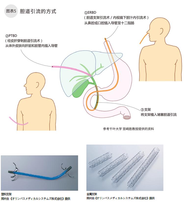 外瘺法,從鼻腔或腹部導出導管,用專用袋子或塑料管儲存膽汁的方式。內瘺法,在阻塞的膽管中植入支架開辟新通道,恢復膽汁正常流動。支架有直徑4mm的塑料支架和直徑10mm的金屬支架。塑料支架可以取出,價格也低廉。但容易發生堵塞或脫落,不能長期使用。