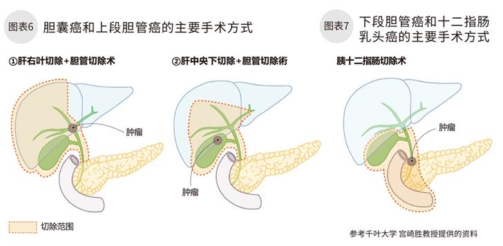 當腫瘤發生在膽囊,或上段膽管時,手術需要將膽囊和膽管,以及周圍的淋巴結、部分肝臟一并切除。如果腫瘤在肝臟偏右的位置,就切除肝右葉(圖表6①肝右葉切除術);偏左就切除肝左葉。如果腫瘤只局限在肝門入口,或者由于肝功能不好而無法切除部分肝臟時,可切除肝中央及以下部位(圖表6②);膽囊癌可以只切除肝臟底部部分。
