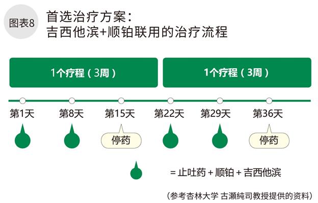 吉西他濱和順鉑聯用的標準治療方案:第1天和第8天給藥,第15天停藥,每3周一個療程(圖表8)。療效和副作用根據每個患者的身體情況不同。英國和日本的臨床試驗數據顯示:該方案最高可實施8個療程。期待可以縮小腫瘤,延緩進展。CT影像顯示腫瘤消失的,可實施手術治療。