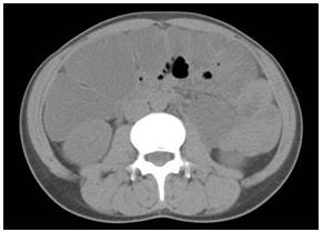 腸道內(nèi)堆積腸道準(zhǔn)備藥物明顯。腎臟前為升結(jié)腸,當(dāng)中是橫結(jié)腸。