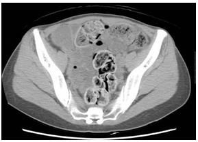腹部全體發(fā)白。由于1.5L腸道準(zhǔn)備藥物停滯腸內(nèi),無(wú)法看見(jiàn)肝下緣,腎陰影,腸腰筋。看似腹水。橫結(jié)腸中有少量氣體。盆腔正中存在硬便和裂縫狀氣體。