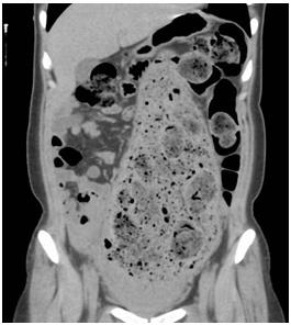 一個(gè)月前剛剛生產(chǎn),與生產(chǎn)部位完全吻合的巨大糞便塊。馬上進(jìn)行了腹部CT 檢查。