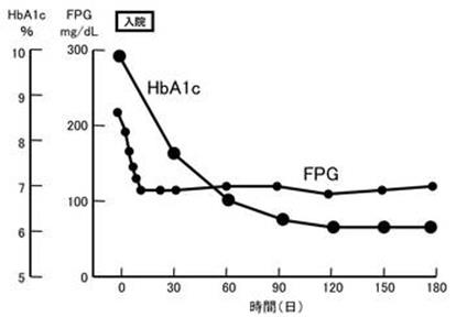 圖2顯示了因明顯高血糖住院的2型糖尿病患者的空腹血糖(FPG)與HbA1c的變化過程。該患者的FPG在剛住院時高達330mg/dL,但2周后降低到110~130mg/dL,之后狀況一直很好。HbA1c水平在剛住院時高達16.3%,1個月后將至11.4%,2個月后8.4%,3個月后7.2%,4個月后6.4%,此后保持恒定值。也就是說,HbA1c在治療后迅速改善,但隨后下降速度逐漸降低,并在4個月時收斂到新值。