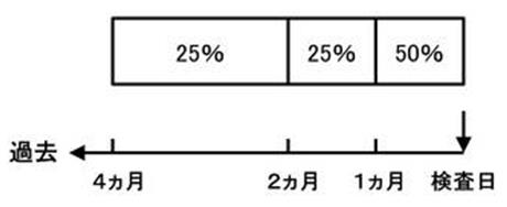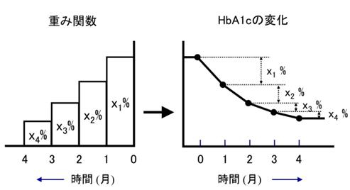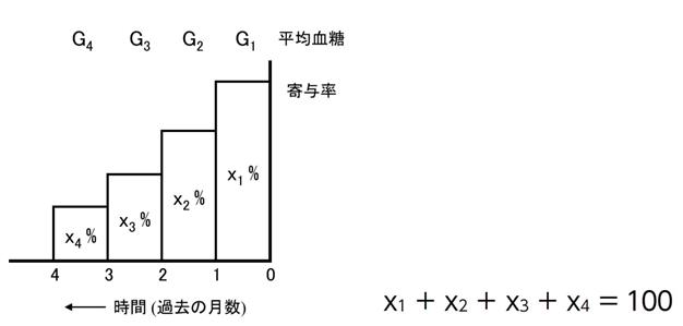 根據上述分析,HbA1c好像既沒有反映出1-2個月前的血糖,也沒有反映出過去的平均血糖。另一方面,考慮到患者HbA1c的變化以及紅細胞的壽命,HbA1c可能反映出了過去120天的平均血糖。因此我們考慮,過去的血糖對HbA1c的貢獻率每個月都不同。
