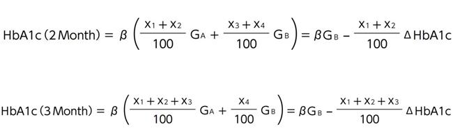 首先,我們先計算治療開始后第一個月的HbA1c。之前的一個月血糖是G A 、再之前是GB,因此可以轉換為以下的計算方式。