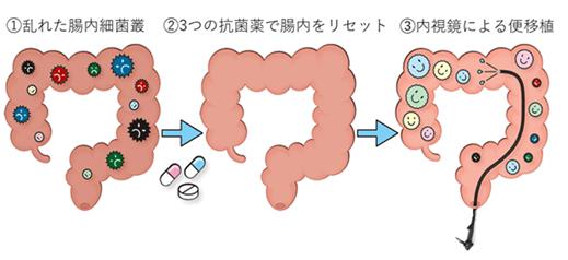我們順天堂于2014年6月開始臨床研究。我們的目標(biāo)是更有效地重建腸道菌群,增強(qiáng)糞便移植療法的效果,并在糞便移植前使用三種類型的抗菌藥物、即“抗菌素聯(lián)合糞便移植療法”進(jìn)行預(yù)處理(圖1)。