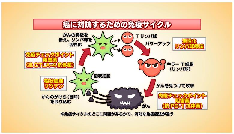 目前,備受矚目的免疫檢查點抑制劑對于血液腫瘤以外的腫瘤的治療有效率大概為10-30%。其中導致7-9成患者治療無效的一個原因是由于患者體內攻擊癌細胞的淋巴細胞數量較少,即使免疫檢查點抑制劑解除了癌細胞對免疫的抑制,也無法發動強大的攻勢。那么,如果通過免疫細胞治療補充了強大的淋巴細胞,那么免疫檢查點抑制劑的治療有效率是否會提高呢?與癌癥抗爭,體內正確的免疫循環是十分必要的(如圖2)。因此,接下來需要繼續進行同類免疫療法的組合研究。