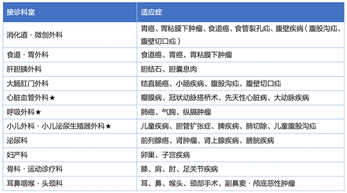 微創(chuàng)手術(shù)的接診科室及具體適應(yīng)癥請(qǐng)參照下表(部分科室接診適應(yīng)癥可能重疊)。