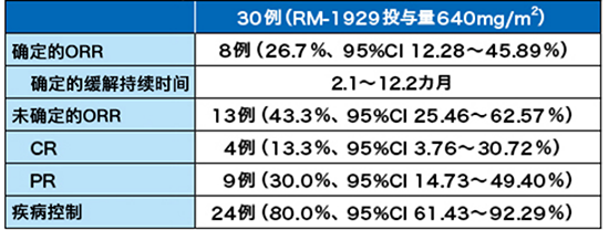 當RM-1929 劑量為640 mg/m2時,3名患者中有1名出現完全緩解CR,1名患者出現疾病穩定SD。9名患者中有7名(77.8%)實現了疾病控制(CR、PR、SD);