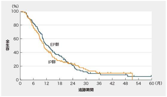 【試驗結果】EP 組的中位總生存期為 12.5 個月,IP 組為 10.9 個月