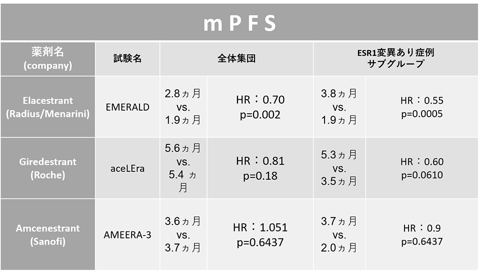 口服SERD的開發目前處于第一線,一些一線治療III期試驗正在進行中,但這些結果給它們蒙上了一層陰影。口服SERD在ESR1突變病例中的療效一直被認為是合理的。但是,未來,我們將等待目前正在進行的 III 期對比試驗的結果,看看它是否真的比現有的 AI 等內分泌療法和氟維司群更有效。(AMEERA-5 試驗已被宣布為陰性試驗。)