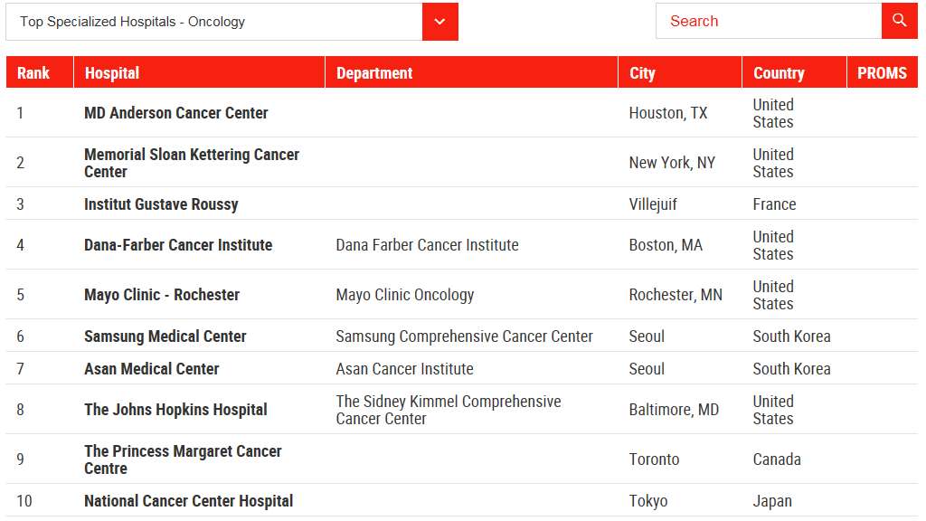 2023 年世界最佳專科醫院(腫瘤學)排行榜(英文原文)