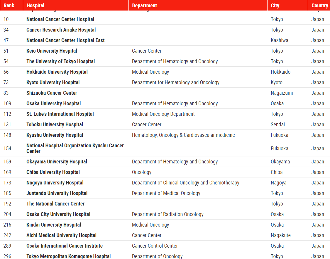 300個最佳專科醫院中,日本共有23所醫院上榜(無中國醫院上榜)。進入前50名的分別為日本國立癌癥研究中心中央病院(第10名),日本癌研有明醫院(第34名),日本國立癌癥研究中心東病院(第47名)。