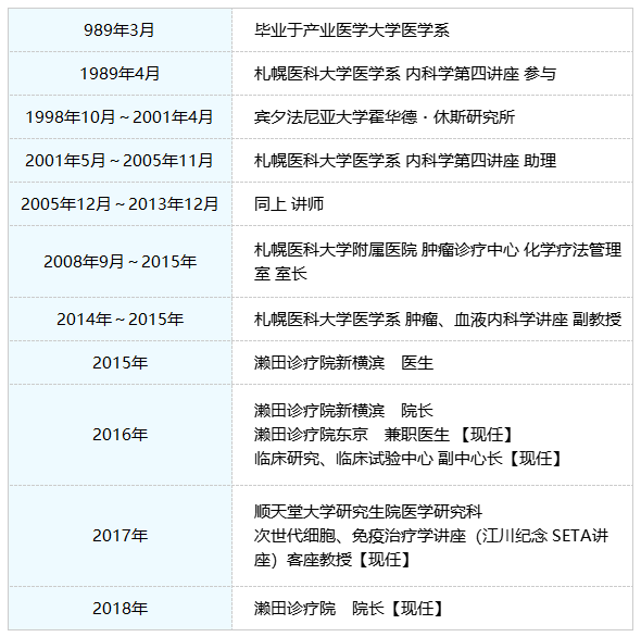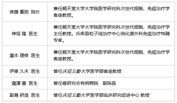 醫生均為來自順天堂大學醫院、慶應義塾大學醫院及癌癥研究會有明醫院的腫瘤科醫生。除了免疫細胞治療外,還可以為患者提供手術、化療、放療以及姑息治療的綜合診療意見。