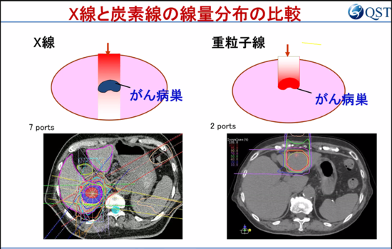 從劑量分布來看,當(dāng)用普通X射線治療時,大量輻射會聚集于病灶并穿透病灶。而重離子束可以在某一深度停止。不僅減少了射線在病灶前的聚集,將射線聚集于病灶,而且射線幾乎不會穿透到病灶后方。目前使用X射線進行的高精度放射治療是通過從各個方向施加輻射來集中劑量的方法。