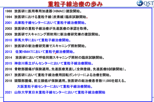 上圖是日本重離子治療的歷史,黑字代表的是QST醫(yī)院(原國立放射線科學(xué)研究所:NIRS),藍字表示其他醫(yī)療結(jié)構(gòu)。1988年日本開始建造醫(yī)用加速器(HIMAC),1994年開始重離子放射治療的臨床試驗。大約10年后,臨床試驗的結(jié)果得到認可,從2003年開始重離子治療被納入先進醫(yī)療,骨和軟組織腫瘤自2016年起納入保險范圍,頭頸部腫瘤和前列腺癌自2018年納入保險范圍. 2022年春季,肝細胞癌、肝內(nèi)膽管癌、胰腺癌、結(jié)直腸癌復(fù)發(fā)、宮頸腺癌也被納入醫(yī)保范圍。