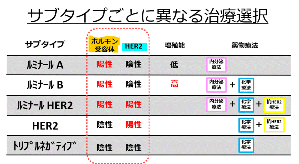 乳腺癌根據(jù)是否存在激素受體和HER2過量表達(dá),被分為4種亞型:“luminal型”、“luminalHER2型”、“HER2型”和“三陰性”。此外,luminal類型根據(jù)細(xì)胞增殖的狀態(tài)分為“luminal A型”和“luminal B型”。這些分類會(huì)影響藥物治療的選擇(見下圖)。