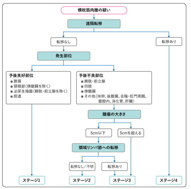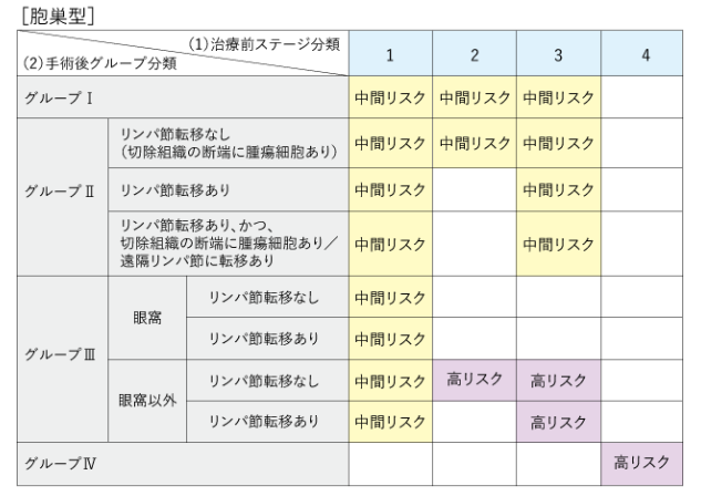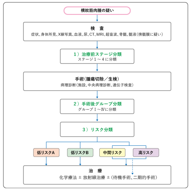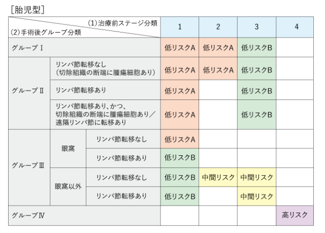 橫紋肌肉瘤沒有全世界共通的風險分類。這里使用的是日本橫紋肌肉瘤研究組的JRS- II風險分類。是結合“治療前分期”和“術后病理分期”的結果分類的。