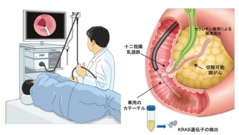注射胰泌素以刺激胰液分泌,并將胃鏡置于十二指腸乳頭(胰管的出口)。通過胃鏡插入一根特殊的導(dǎo)管,然后通過導(dǎo)管的側(cè)孔用 20 毫升生理鹽水沖洗十二指腸乳頭區(qū)域。從導(dǎo)管頂端的六個孔中收集十二指腸中的清洗液。檢測回收液中的 KRAS 基因突變。
