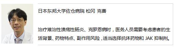 日本武田制藥研發的Vedolizuma治療潰瘍性腸炎,于2014年已經通過美國FDA的審批,在歐美開始使用,并有豐富的使用經驗。松岡醫生介紹:“該藥作用于腸道選擇,數據顯示感染等副作用較少,在歐美被醫生們作為一線治療藥物使用。但是日本目前還缺乏使用經驗,又因為藥物作用機理新穎,所以醫生們用藥時比較慎重。”