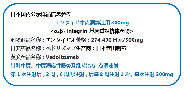 2018年11月7日,日本上市了針對潰瘍性腸炎α4β7整聯蛋白的抗體藥物“エンタイビオ”。該藥通過干擾記憶性T細胞表面蛋白“α4β7 integrin”來抑制結直腸的自體免疫。α4β7整聯蛋白主要與腸道內膜血管內皮細胞上的粘膜尋址細胞MAdCAM-1結合,介導淋巴細胞浸潤腸道黏膜,而エンタイビオ可以幫助腸管選擇性的阻擋淋巴細胞浸潤。