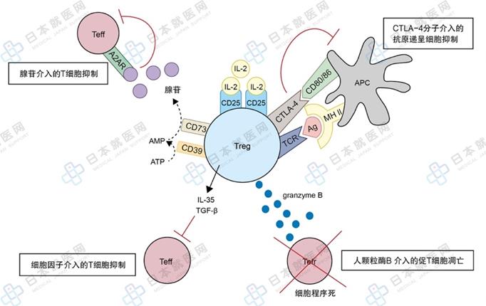 Treg細胞膜表面除了CD25陽性,還有CTLA-4、TNF受體超級家族、OX40等并存。Treg在免疫抑制中發(fā)揮的重要作用,如通過本身具備的CTLA-4抑制抗原遞程細胞(APC)。CTLA-4與抗原遞程細胞上的共刺激分子相互作用,向APC發(fā)送共刺激信號來妨礙T細胞的激活(沒有活性的T細胞不能發(fā)揮清除功能)。同時,Treg的CD25與促免疫因子IL-2親和力更強,搶先與IL-2的受體結(jié)合后,達到抑制周邊免疫應(yīng)答的目的。它還能通過自身的CD39和CD73蛋白轉(zhuǎn)化細胞外的ATP(能量)通路抑制T細胞的激活。Treg自身也分泌細胞因子抑制免疫應(yīng)答(如圖)。