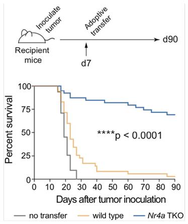 這些研究人員在類似于給患者進行CAR-T細胞灌注的條件下開展測試。他們通過遺傳方法對源自患者的T細胞進行基因改造,使得它們成為具有攻擊腫瘤能力的CAR-T細胞。這些CAR-T細胞隨后被輸注到接受腫瘤移植的小鼠體內。 實驗組小鼠還接受了基因修飾,從而使得它們的CAR-T細胞缺失了Nr4a家族成員,然而,對照組小鼠保留了這些Nr4a家族成員。