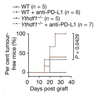 “當我們將YTHDF1敲除與PD-L1抗體聯合使用時,我們幾乎控制住了所有小鼠的腫瘤,”何川說。