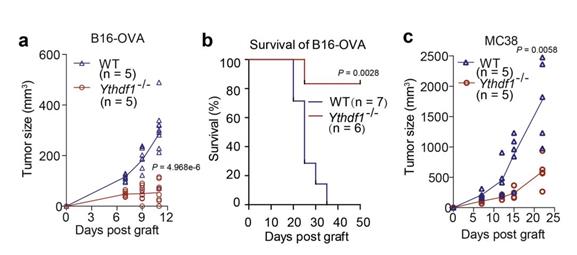 研究人員將黑色素瘤和腸癌細胞分別接種到YTHDF1基因敲除和野生型小鼠身上。在兩種癌癥模型小鼠身上,研究人員都觀察到了YTHDF1基因敲除小鼠腫瘤的大小遠小于野生型,而且YTHDF1缺陷型小鼠身上腫瘤抗原特異性CD8陽性T細胞和NK細胞的反應也更猛烈。